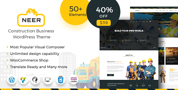 Neer WordPress Theme is a user friendly construction theme, which can be used for architecture templates and business websites too. Build your website with your own imagination with Neer no matter if you are in factory, Industry, Industrial, Construction, Engineering, Machinery Business, Commodity Business, Power, Rail Business, Airplane, Ship Business, Oil & Gas Business, Petroleum business.